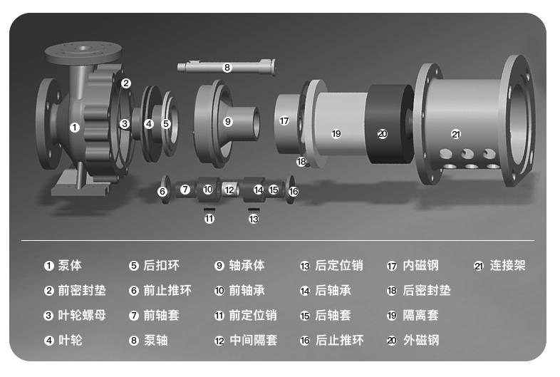 脫硝氨水泵主要由泵體、葉輪、泵軸、軸承、軸承體、隔離套、止推環(huán)、聯(lián)接架、磁傳動器等零部件組成。