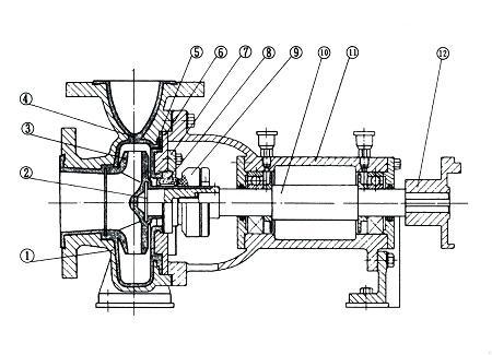 IHF型氟塑料離心泵的泵體材質(zhì)采用金屬外殼內(nèi)襯聚全氟乙丙烯(F46)、葉輪和泵蓋均采用金屬嵌件外包氟塑料整體燒結(jié)壓制成型,軸封采用外裝式波紋管機(jī)械密封,靜環(huán)選用99.9%氧化鋁陶瓷或炭化硅,動(dòng)環(huán)采用四氟填充材料或炭化硅。其特點(diǎn)是該泵結(jié)構(gòu)先進(jìn)合理,耐腐蝕強(qiáng),密封性能?chē)?yán)密可靠,工作穩(wěn)定,噪音低,使用壽命長(zhǎng)。
