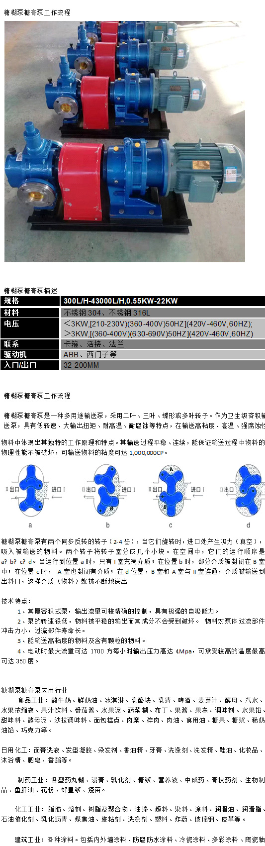 高粘度顆粒泵粘性帶顆粒液體泵采用二葉、三葉、碟形、多葉型的轉子,是一種多用途容積式輸送泵。它具有轉速低、輸出扭矩高、耐高溫、耐腐蝕等特點,是一種容積式顆粒料漿泵,其獨特的工作原理和特點使其輸送過程平穩(wěn)、連續(xù),并且能夠保證物料在輸送過程中物理性能不被破壞,可輸送的物料粘度高度1000000CP。